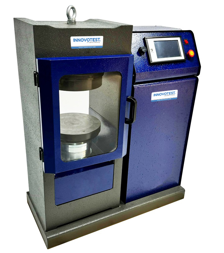 Gövde: Kaynaklı tip monoblok konstrüksiyon, farklı kapasitelerde mevcuttur (1000kN, 1500kN 2000kN ve 3000kN), alt tarafta düşük sürtünmeli tek etkili piston, EN-12390-4 standardına uygundur, farklı boyutlardaki numuneleri test etmek için ara mesafe plakalarıyla (2x50mm, 1x70mm) birlikte verilmektedir, üst oynar başlık küresel yapıda olup yükün homojen dağılımı için 3° hareket edebilir yapıdadır, sert tabla yüzeyleri sertleştirilmiş ve pürüzsüzleştirilmiştir, farklı boyutlardaki küp ve silindir numuneleri test etmek için uygundur, dikey test mesafesi 336 mm'dir.