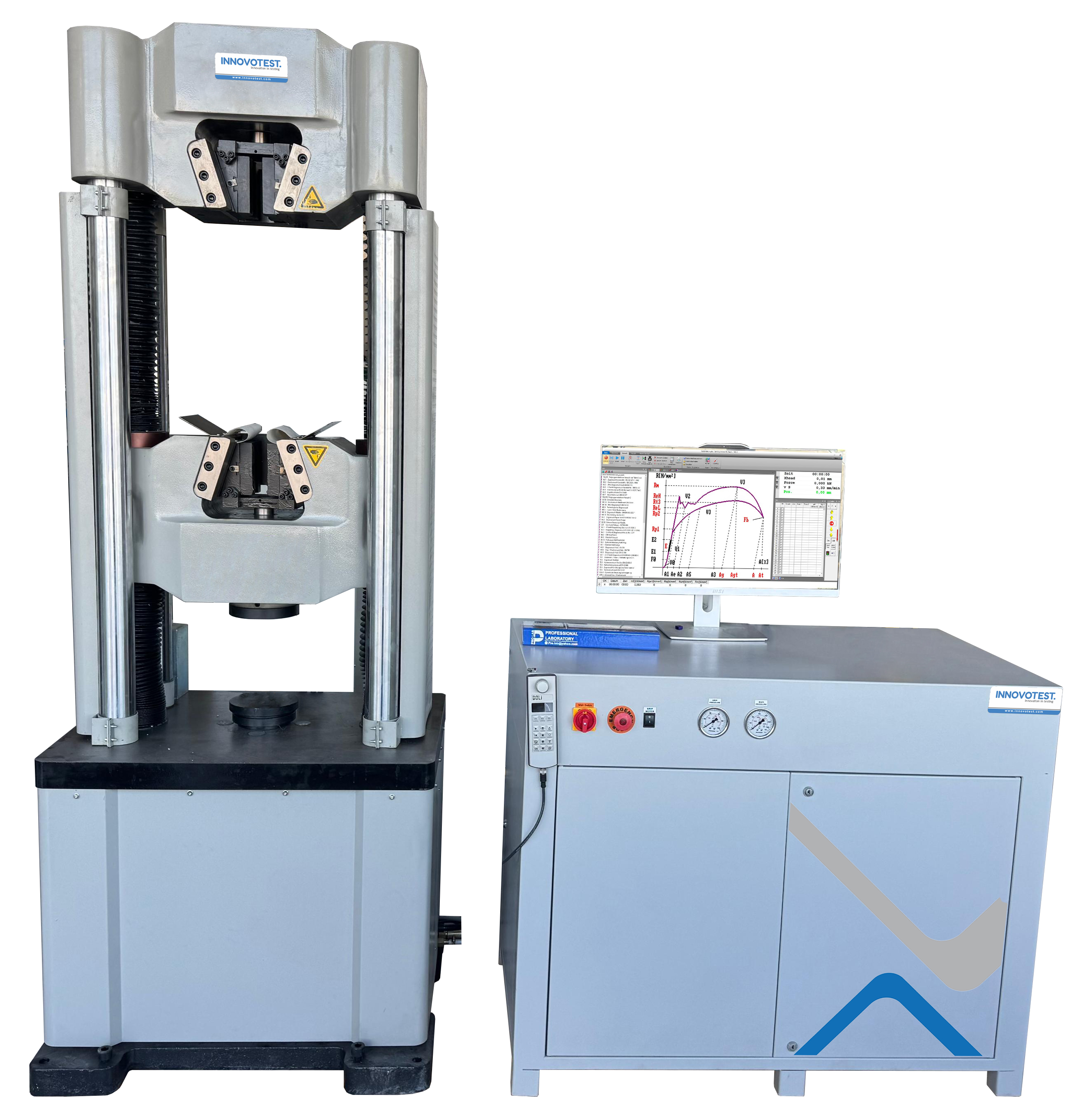 Test sistemiyle birlikte sağlanacak üniversal test yazılım, tüm fonksiyonların bilgisayar üzerinden kontrol edilmesine olanak tanır. Yazılım ile gerçek zamanlı yük, stres, deplasman, deformasyon ve kullanıcı tanımlı parametreler görüntülenebilir. Veriler grafik ekranına aktarılabilir ve grafik eksenleri kullanıcı tarafından özelleştirilebilir. Yazılım, EN 6892-1 standartlarına uygun olarak gerinme (strain) ve gerilme (stress) kontrollü testler yapabilme yeteneğine sahiptir. Sonuçlar, kullanıcı tanımlı rapor formatında ya da ham veriler şeklinde Excel formatında alınabilir. Sistem, 380 Volt, 50 Hz elektrikle çalışmaktadır.